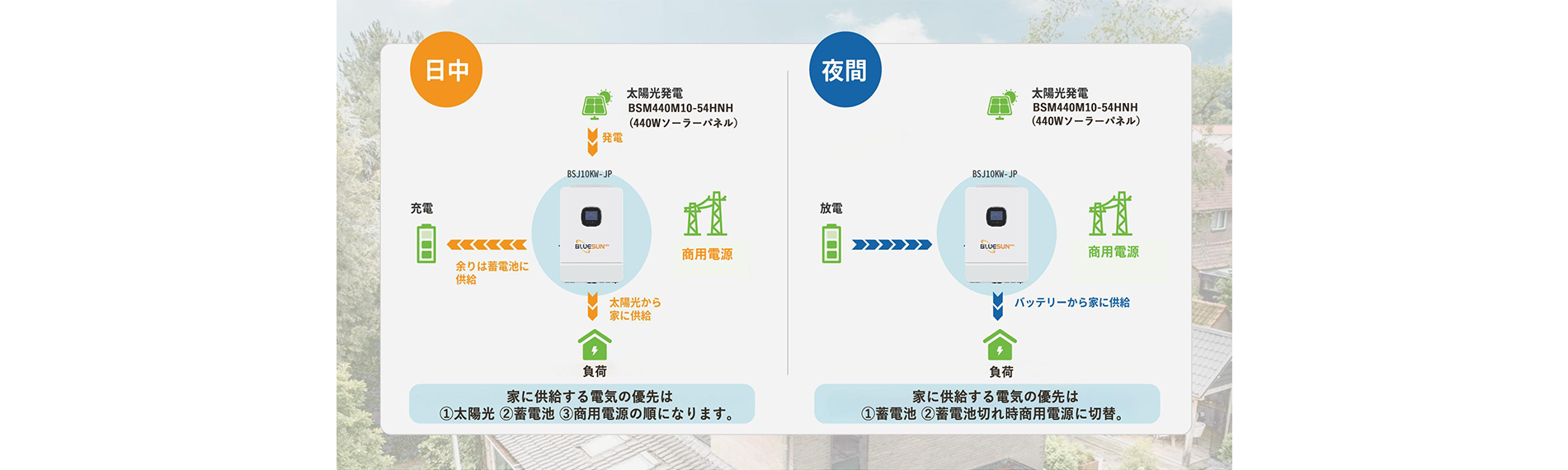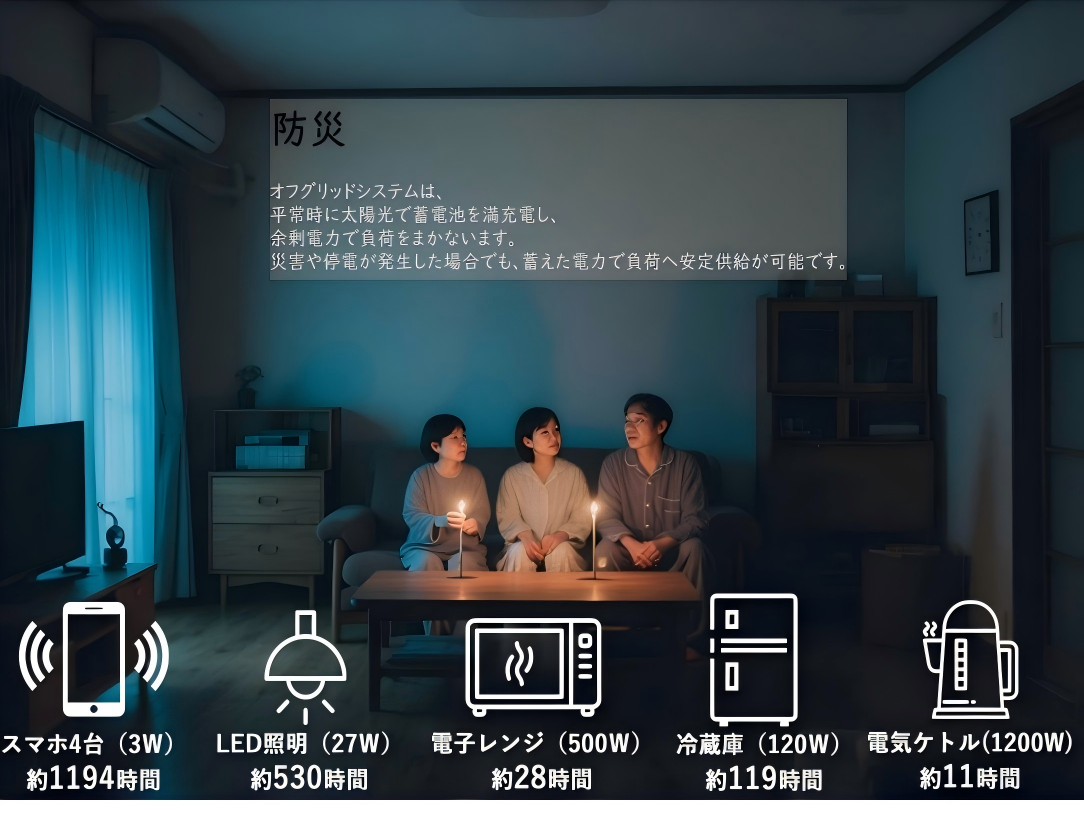 電力会社の送電網から売電を行わず逆潮流(reverse current)を行わない電カシステムを 「オフグリッド」と呼びます. 現在主流となっている太陽光発電システムは、太陽の光エネルギーを吸収することで発電した電力を家庭で使用し、余剩電力は電力会社に売電します。