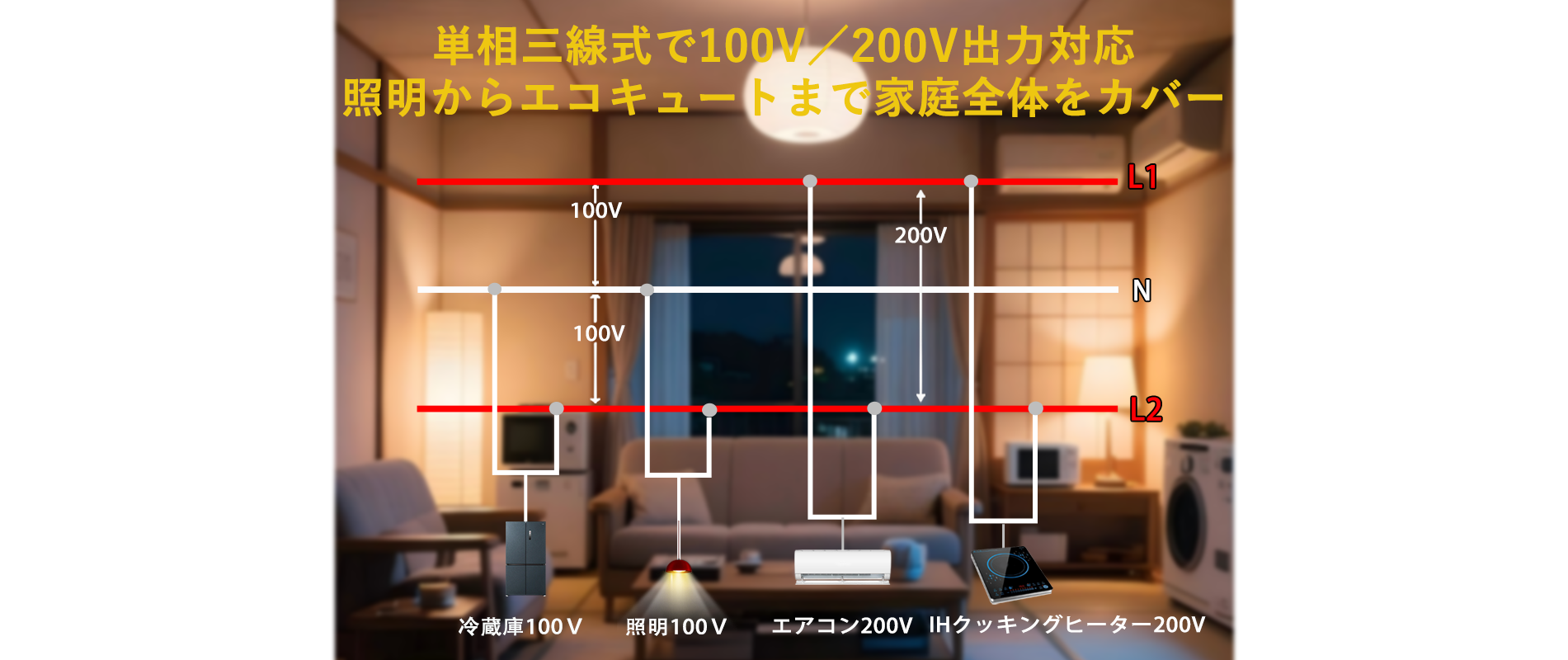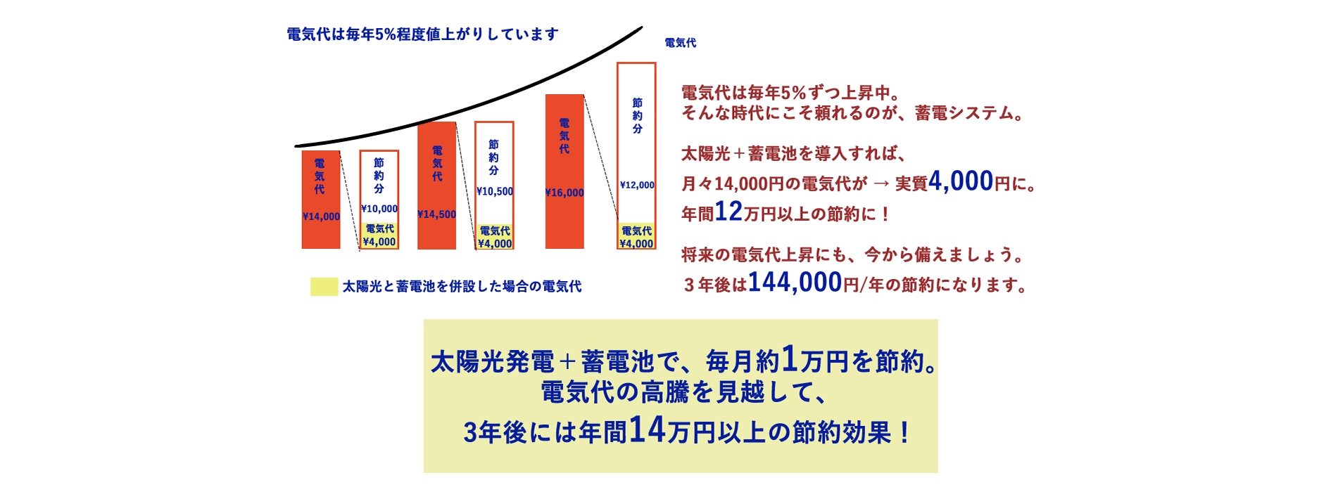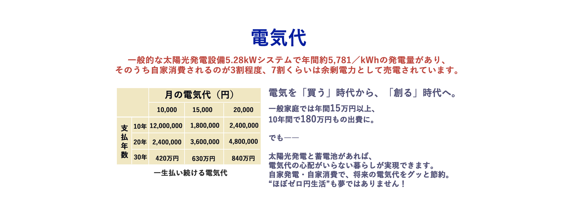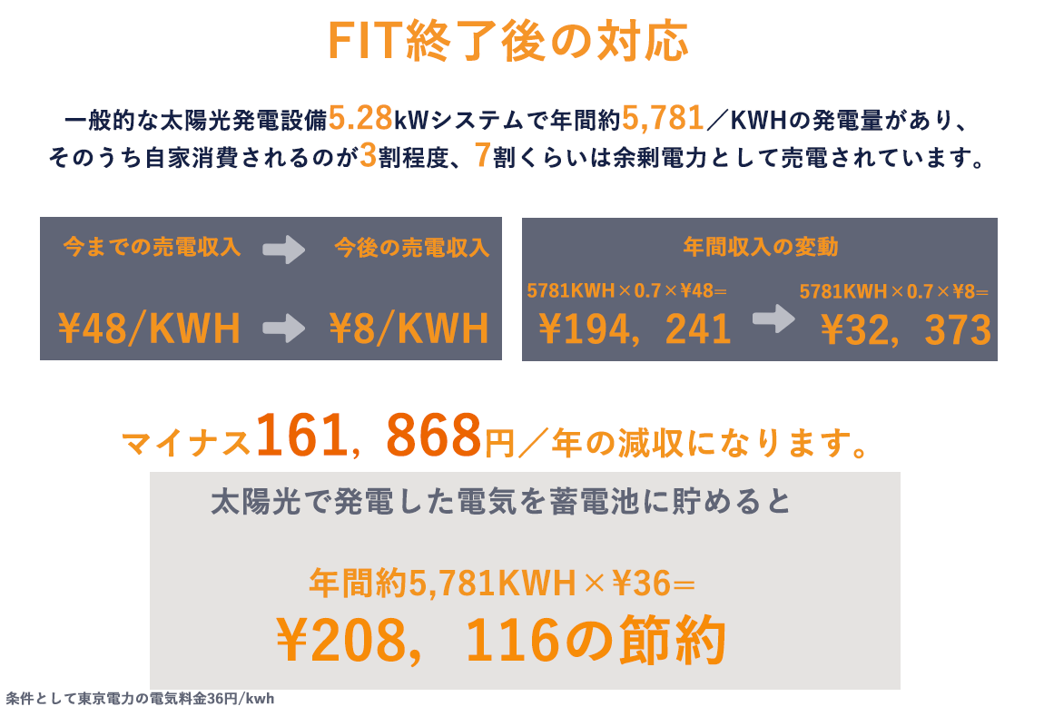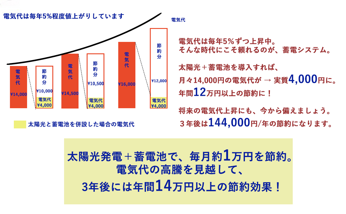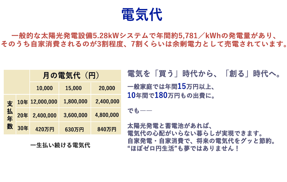 しかし電力会社の買取価格は年々下降しており、近年頻発している大規模自然災害への備えからも、余剩電力は売電することなくバッテリーに充電し、夜間や停電時の使用に備えます。高価な電力を購入する必要もありません。
